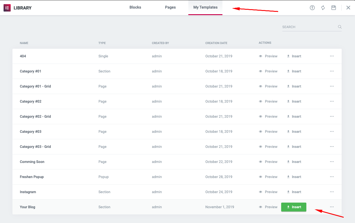 Now, users are able to place the new templates in any position in a page, post, product, popup, etc. You can do that by clicking on the document icon, choose My templates then hit the Insert button.